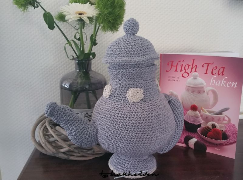 Laat ik bij het begin beginnen. Al zoekende in de kast tussen de haakboeken kwam ik ‘High tea haken’ van Cristel Krukkert als eerste tegen. Ik wist gelijk dat ik de theepot als eerste wilde gaan haken. Zo gezegd, zo gedaan.