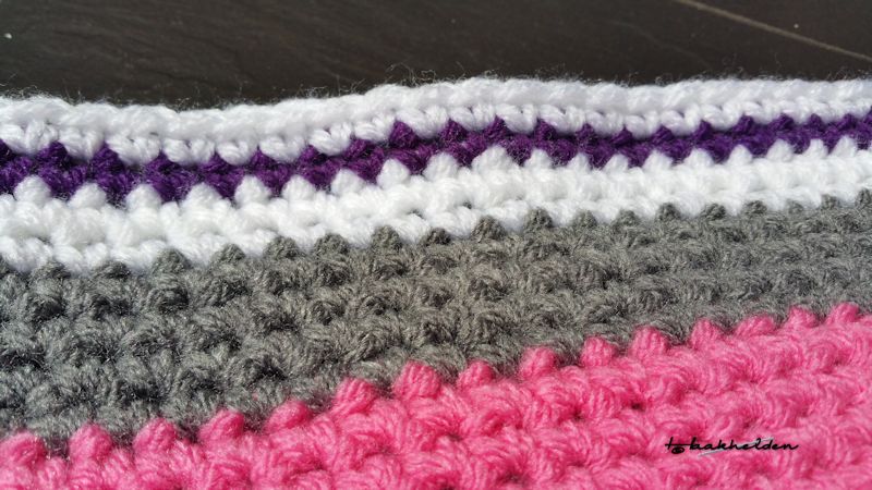 Ik haak het kleed met Royal wol van de Zeeman. Ik wil er verschillende kleuren voor gebruiken, maar ben begonnen met roze, grijs, wit en een beetje paars. Ik heb met dubbele draad op haaknaald 8 mm eerste een lapje van twintig steken breed en twintig toeren hoog gehaakt. Daarna ben ik deze gaan ‘omhaken’, zodat ik rondom het beginlapje haak. Ik de hoeken heb ik steeds drie vasten gehaakt.