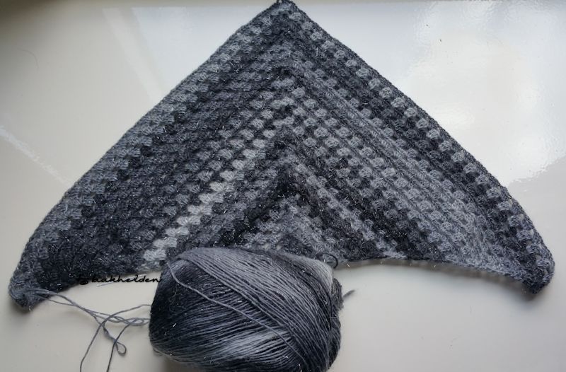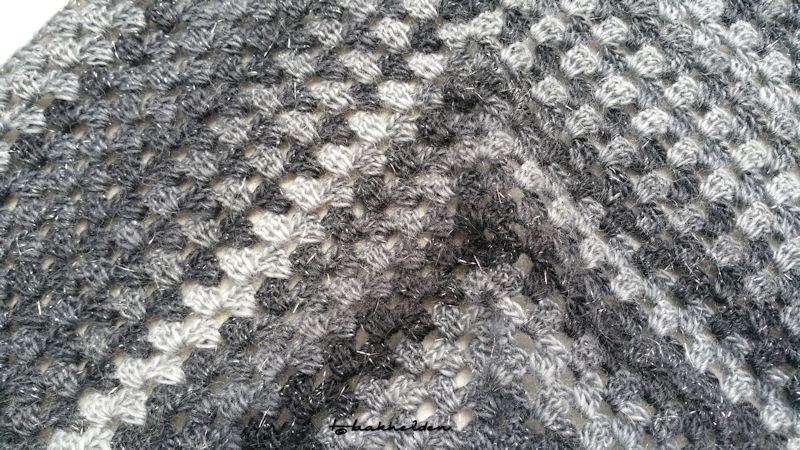 De gebruikte wol is: Langyarns Mille Colori. Ik heb de grijs/zwarte variant met een klein glimmertje. Je kunt het haken met haaknaald 2,5 – 3,5 mm. Ik gebruik zelf 2,5 mm. De gebruikte steek is de granny stripe. Ik haak wel elke keer één losse.
