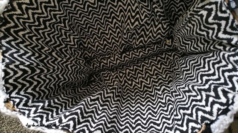 Daarna ben ik gelijk begonnen aan de andere bestelling. De opdracht was ook een zwart- witte uitvoering met gehaake hengels en een flap met knoop. Inmiddels is de tas zelf klaar. De andere genoemde onderdelen ga ik nu eerst haken en dan komt het in elkaar zetten. Ook deze tas ga ik voeren, want de ontvangster wil diezelfde leuke zwart-witte stof. De bestelling heeft wel enige vertraging opgelopen, omdat ik afgelopen week geveld was door de griep :(. Maar dit weekend is hij zeker klaar!