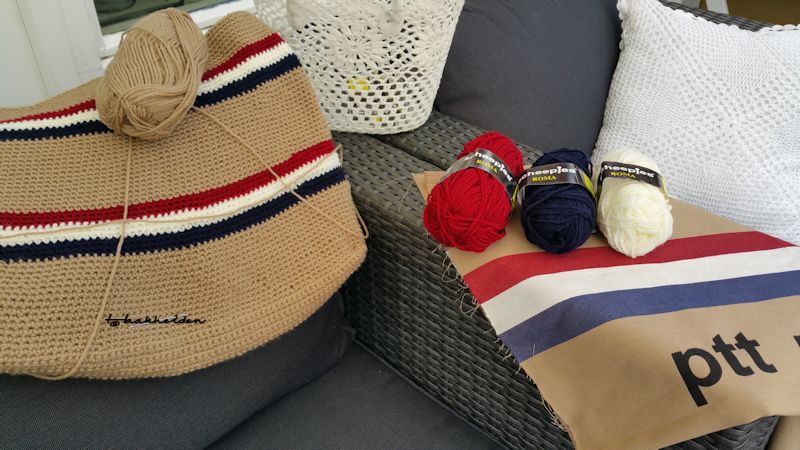 Toen wij op pad gingen om een stofje te kopen voor het eerste naaiproject zag ik daar het bekende ‘PTT’ stofje liggen. Oh, oh ik was natuurlijk gelijk verliefd op dit stofje, want wilde vanaf het begin al een AH tas in deze kleuren maken. Daarna zijn we snel op zoek gegaan naar een wolletje in dezelfde kleur. En ja hoor, mijn nieuwe project was geboren: een AH shop tas in de ‘PTT’ kleuren. Dit is nu mijn tas nummer zes dus ik mag nu wel spreken van een tassen ‘haaktic’ haha!