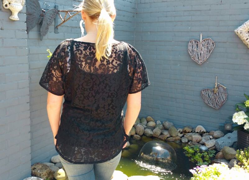 Met trots kan ik jullie melden dat het tweede naaiproject onder het naaimachine vandaan is! Het is een zomers topje van zwart kant. De voorkant is korter dan de achterkant. Ook heb ik de achterkant rond laten lopen. Samen met Haakheld Monique is het gelukt!