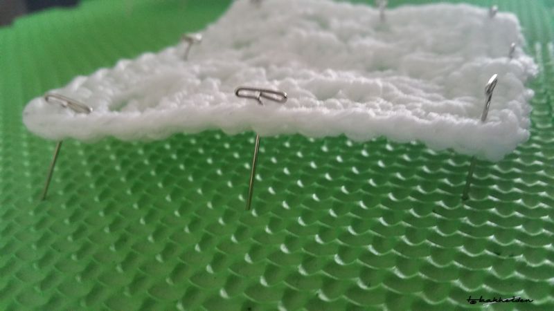 - Met t-spelden heb ik eerst het haaksel opgespeld op mijn blockmatjes van Knitpro (gekocht bij het Koperdraadje) en heb ze daarna voorzichtig en beetje bij beetje opgespannen.