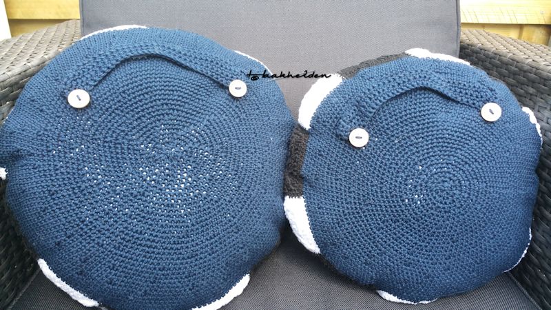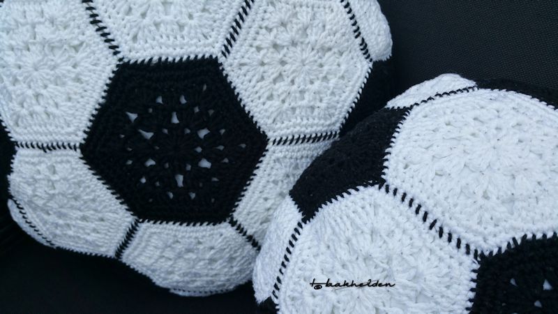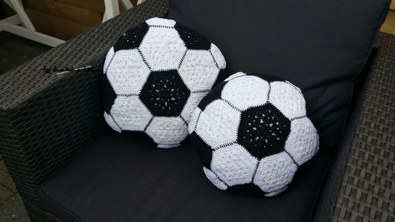 Zijn grootste hobby is het bezoeken van voetbalstadions en wedstrijden bekijken. Het cadeau moest dus iets met voetbal te maken hebben. Ik ging op zoek naar een patroon en kwam al snel uit op het voetbalkussen. Dit is een kooppatroon van Haakidee. De voorkant bestaat uit negentien granny’s die samen een voetbal vormen en de achterkant is een effen kleur. Ik heb twee kussens gehaakt.