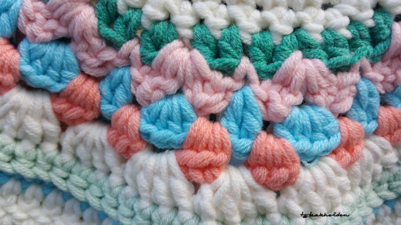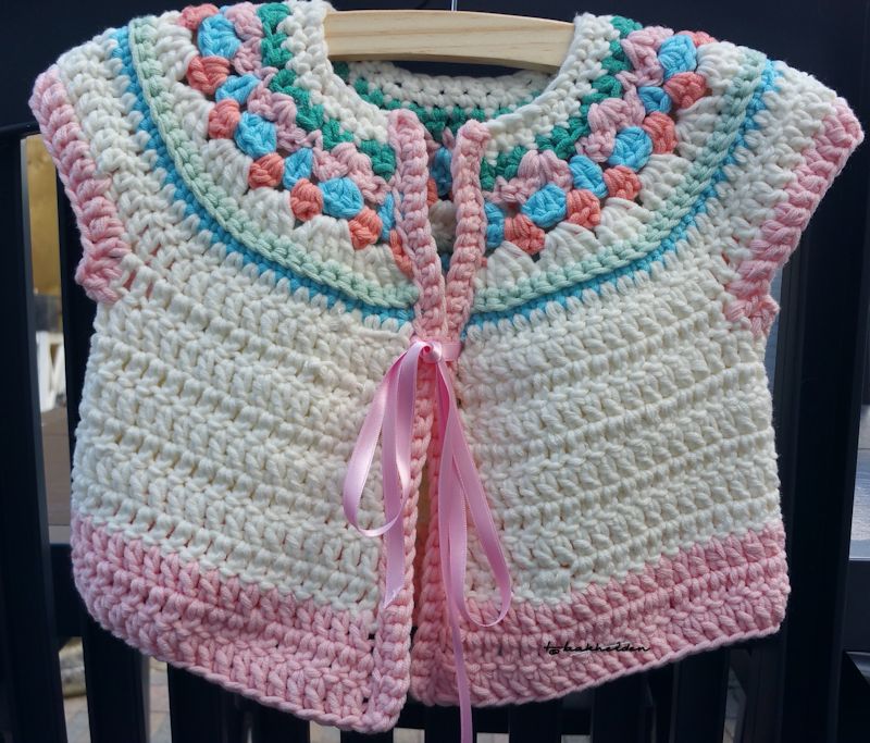 Zo verliefd ik al was, ben ik nu nog meer in ♥ love met het resultaat. De ‘pasteltintjes’ komen erg tot zijn recht, vind ik zelf, omdat de hoofdkleur in dit patroon ivoor is. En als kers op de taart: een satijnen strik om het vestje te sluiten.