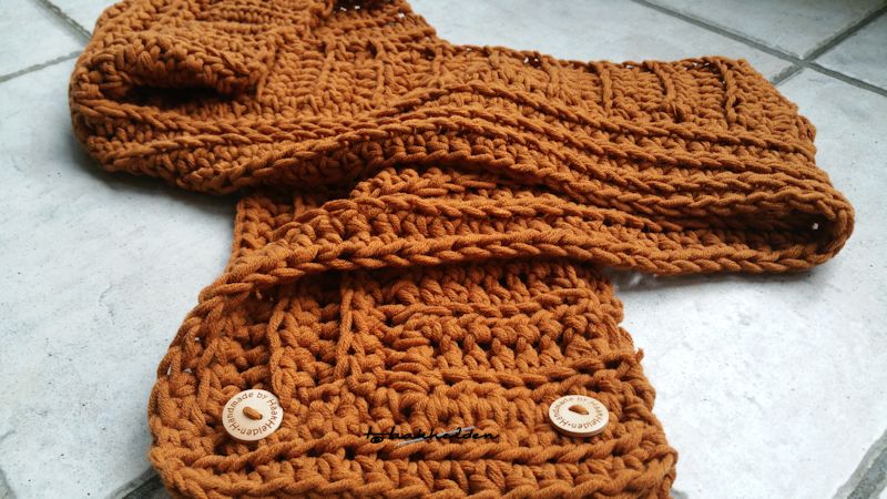 Ik ga hem zeker nog een keer haken in de kleur wolwit en dan maak ik hem wat breder, maar verder neem ik dezelfde steek en patroon. Voor het knoopsgat had ik zoals in het patroon is aangegeven één losse gehaakt en één steek overgeslagen. Maar dit laat ik bij een tweede sjaal achterwege. Het knoopsgat wordt dan te ruim. Door de steek is er ruimte genoeg om de knoop dicht te maken.