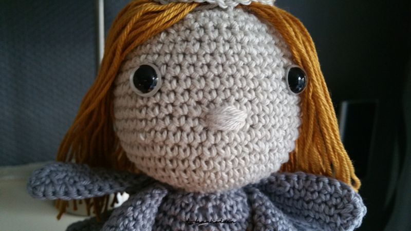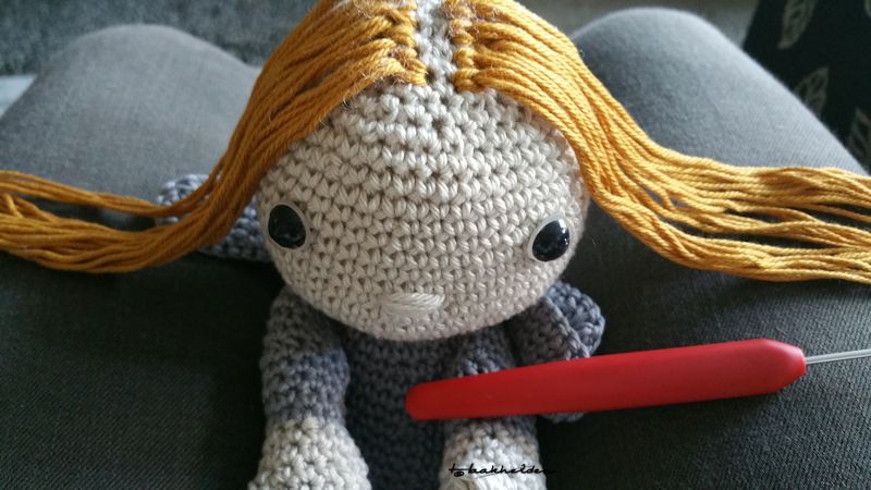 Ik heb al best veel amigurumi’s gehaakt, maar het haar was voor mij nieuw. Het was dan ook even uitvogelen hoe ik dat het best kon aanpakken. Al was het in het patroon duidelijk omschreven, had ik de eerste keer dat de ‘hoofdhuid’ nog wat kaal bleef. Uiteindelijk, na twee keer het ‘haar’ er weer uitgehaald te hebben, heb ik met dubbele draad, naar eigen tevredenheid het juiste resultaat gekregen.