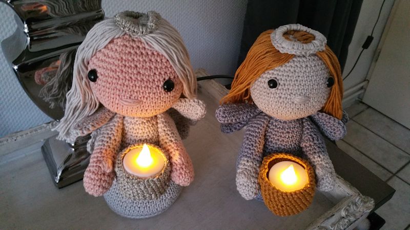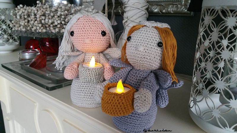 Ik ben in bezit van enorm veel waxinelichtjes die je kunt opladen via stroom. Ik was dan ook gelijk verliefd, toen wij op de amigurumidag waren, op het patroon van de kerstengel van Christel Krukkert. Ze had het engeltje meegenomen, dus konden wij haar in ‘levende lijve’ zien. Het leuke eraan vond ik dat hier ook zo’n oplaadbaar waxinelichtje in past. Yes!