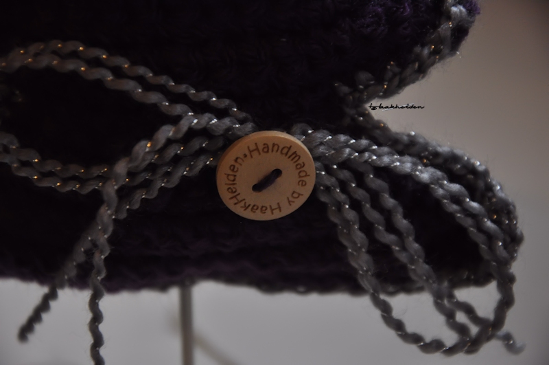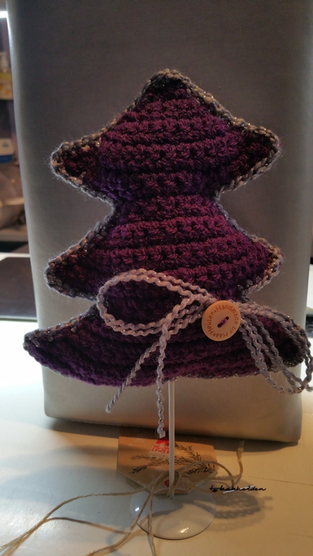 Het eerste kerstboompje met kerstkaart is inmiddels al uitgereikt en wel aan onze lieve Jessica die al jarenlang voor onze kerstnageltjes zorg draagt. Ik heb het kerstboompje in de kleuren gehaakt van haar salon; paars met zilver.