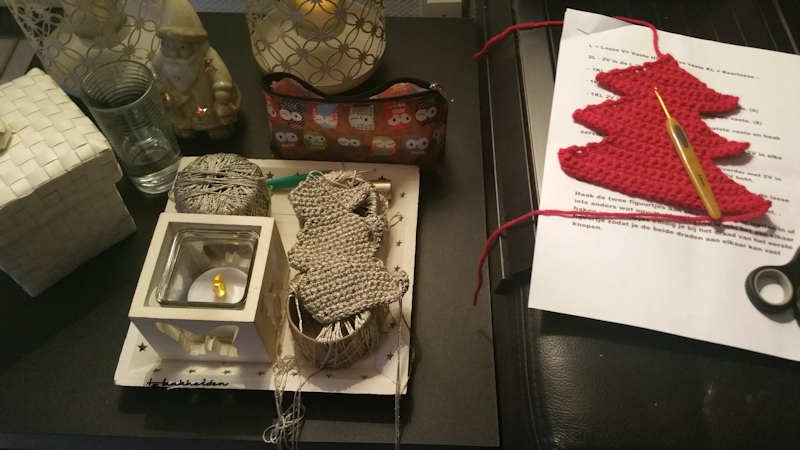 En dan….alles hangt, staat en brandt en dan gaan wij nadenken over wat voor soort kerstkaarten er dit jaar de deur uit gaan. Het lijkt mij heel leuk om er een persoonlijk tintje aan te ‘hangen’, tenslotte zijn we de Haakhelden hé. Dus het idee is om kerstboompjes te haken voor mensen die in de buurt wonen. Voor de mensen waar de kerstkaart in een enveloppe verstuurd wordt, wil ik er dan iets ‘plats’ bij haken.