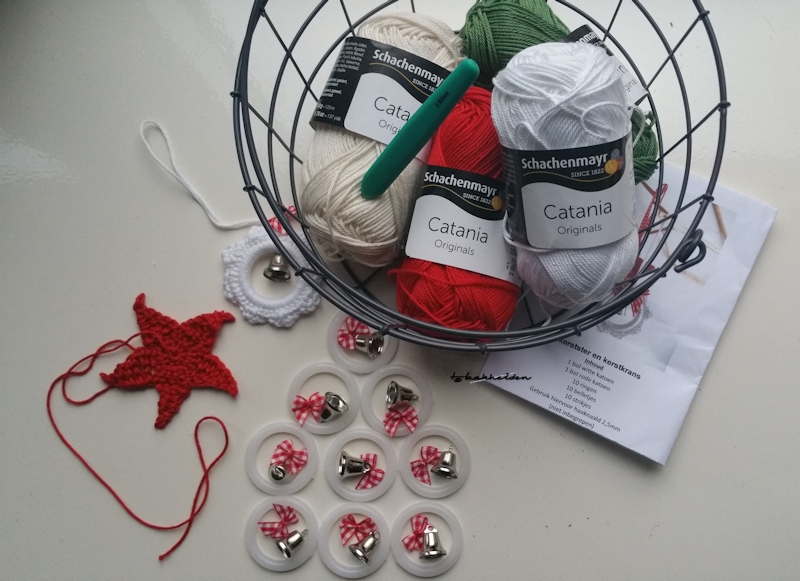 Voor de ‘platte’ haaksels in de envelop had ik bij Echtstudio dit pakketje al meegenomen. Het is een compleet setje met bolletjes garen en werkbeschrijving. Het kost € 12,50. Het haakt snel weg en is ontzettend leuk om te doen. Om te versturen haak ik het meesten de sterren, want ik weet niet zeker of de ringetjes in de envelop passen. Maar op internet zijn vele platte haakseltjes te vinden. Dus gaat het helemaal goed komen dit jaar met onze kerstgroeten.