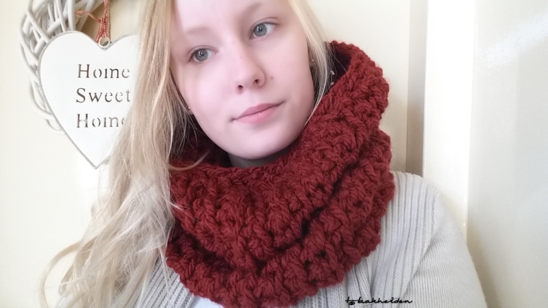 Als je het wikkel eraf haalt, zie je aan de binnenkant een breipatroon staan. Leuk, maar ik kan niet breien, haha! Dus moest ik zelf iets bedenken. Maar dat vind ik absoluut geen probleem, haha! Ik heb gekozen voor vasten, maar dan net ietsjes anders. Zo heb ik de colsjaal gehaakt: