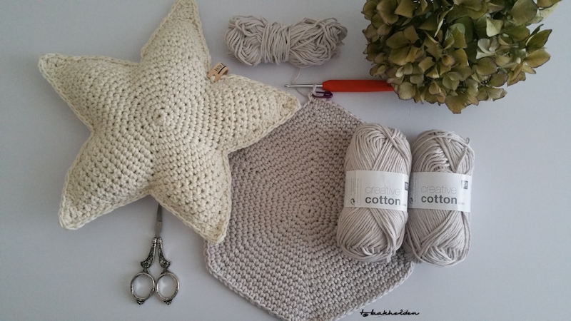 In het boek wordt het grote sterkussen gehaakt met Byclaire nr 2, maar ik gebruikte het Rico creative Cotton Aran garen op haaknaald nr 4 mm. In de kleur natural, kleurnummer 60, had ik genoeg wolletjes 🙂 De doorsnee van dit kussen is bij mij zo’n 53 cm geworden.