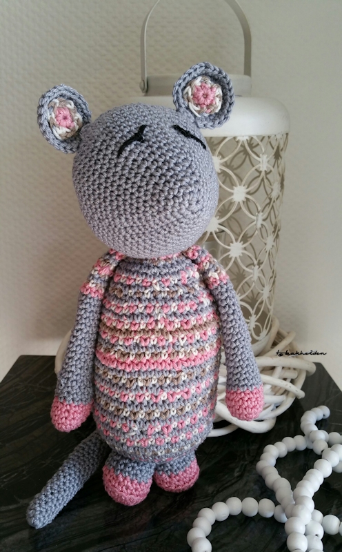 Nadat ik dit ‘konijnen kussen’ haakte, viel ik daarna gelijk voor het muisje. Weer van die oogjes ..smelt…haha! Grappig eigenlijk hé dat één draadje zwart deze lieve uitdrukking kan geven aan een project :). In het boek wordt dit muisje met By Claire nr.1 gehaakt. Zelf heb ik dit project gehaakt met bolletjes en restjes die ik nog had op haaknaald 3 mm. Ik gebruikte de volgende kleuren: