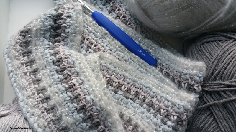 De sjaal is lekker lang. Ruim 1.70 meter zonder franjes kan dus met gemak twee keer omgeslagen worden. Maar ik had een grijze lederen sjaal lus besteld bij De Haakfabriek. Ook op de manier, zoals op de foto onder, is hij heel fijn te dragen. Enorm zacht is deze sjaal ook door het fluffy garen Phildar Phil diamant. Er zit een prachtig, bescheiden glimmertje in dit garen verwerkt waardoor er een mooie glans ontstaat. Echter komt dit niet goed tot zijn recht op de foto’s. Kortom: ik ben super blij met weer een leuke sjaal aan de kapstok !