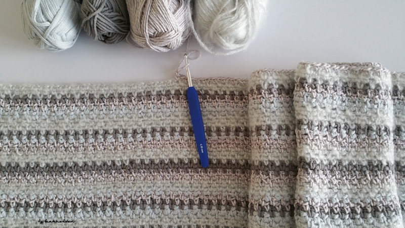 Het haakpakket bestond uit nieuwe garens van Phildar gecombineerd met Scheepjes Softfun. Ik heb de kleuren combinaties iets aangepast naar eigen smaak en ging met deze mooie grijze tinten aan de slag. De garens die ik gebruikte: