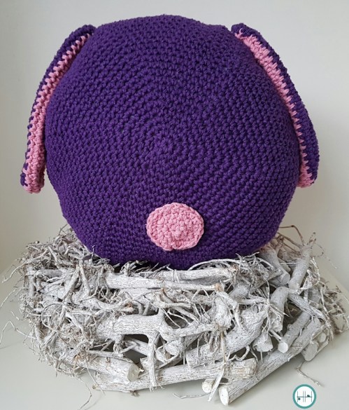 Volgens het patroon heeft dit kussen een pompoentje als staartje. Dit vond ik met dit garen niet zo tot zijn recht komen. Al eerder haakte ik een dierenkussen en dat staartje heb ik nu ook gebruikt. Zijn achterkantje is zeker ook de moeite waard. Vinden jullie niet? Haha! Het was erg leuk om dit kussen te haken. Zoals ik al zei hebben we nog drie leuke bollen om te testhaken. Op mijn Instagram (@haakheldmonique) kun je daar het begin al van zien. In een andere ‘Bezige vingers’ zal ik over het tweede Tek-Tek project vertellen. Ook zal ik in een apart blogbericht dit garen reviewen. Wordt vervolgd…