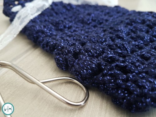 Toen ik het boek ‘Mooi van Draad’ voor het eerst inkeek, zag ik gelijk het make-up tasje. Als je het verhaal hierboven hebt gelezen, snap je waarom ik als eerste dit make-up tasje wilde gaan haken. Zoals jullie weten ben ik gek op (azuur)blauw. Voor een make-up tasje vind ik een lichte kleur niet echt handig, want dat wordt toch al snel vies. Daarom koos ik ByClaire Sparkle in de kleur: Navy (321). Dat is een hele donkerblauwe kleur met subtiele donkerblauwe glitters. Ik gebruikte haaknaald 3,5 mm en wit kant om het make-up tasje af te maken.