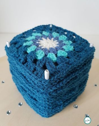 wat een mooie blauwe tinten! Goed idee om er een kussentje van te maken. Ik nijg meestal naar de grotere projecten als dekens, maar dit is net zo leuk eigenlijk 🙂