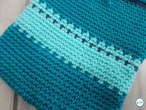 Dan pak je de draad in kleur B en haalt deze door de twee lussen heen. Dit herhaal je elke steek. Het effect is dat elke steek afwisselend kleur A of B heeft. Aan het einde van deze toer hecht je kleur A af en haak je in de volgende toer verder in alleen kleur B. Je krijgt daardoor een soort zigzag in je haakwerk. Dit kun je zo vaak als je wilt herhalen, maar je kunt natuurlijk ook alleen maar effen toeren haken in 1 kleur.