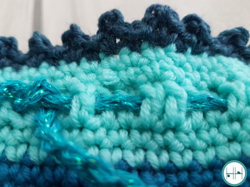 Met Durable Glam in de kleur zeeblauw heb ik een lange ketting van lossen gehaakt en door de toer met stokjes geweven. Daardoor kan het zakje dicht. Daarna is het een kwestie van alle draadjes afwerken. Et voilà: mijn zakje was klaar!