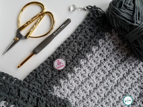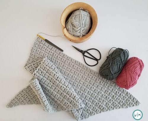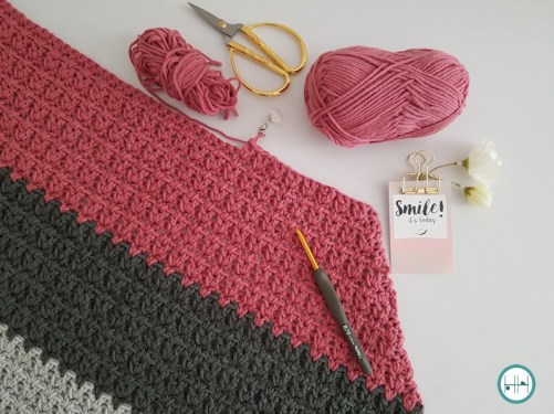 De omslagdoek bestaat uit drie kleuren. Althans, het orginele ontwerp 🙂 Je staat natuurlijk altijd vrij in je eigen kleurkeuze haha! Daarom heb ik zelf meerdere toeren gehaakt met de kleur antraciet in plaats van twee toeren. Het eerste, grootste gedeelte, begon ik met lichtgrijs. Ik wil dan altijd zo snel mogelijk met een nieuwe kleurtje haken. Het gevolg is dat je steeds sneller gaat haken, haha! Hebben jullie dat ook? Helemaal blij was ik toen ik eenmaal bij mijn favoriete framboos kleurtje was aangekomen.