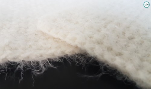Ondanks het harige en pluizige draadje kon ik wel de steken nog goed zien. De eerste keer gebruikte ik de aanbevolen naald 5 mm. Toen werd mijn lapje veel te klein. Ik moest daarom uithalen, maar dat was niet heel erg makkelijk. Ik heb uiteindelijk de schaar er gewoon ingezet. Dan maar een paar meter minder. Ik heb blok drie uiteindelijk dus gehaakt met haaknaald 5,5 mm.