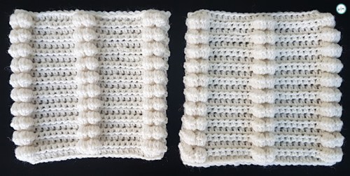 De nopjes in dit patroon maak je met vijf samengehaakte stokjes. Ik vond het de eerste keren lastig om twee noppen direct achter elkaar te haken. Het is even friemelen met de steken, omdat het eerste nopje een beetje over mijn volgende steek lag. Na de derde toer noppen was het gelukkig al niet meer zo’n gefriemel. Kortom: als je stokjes en halve stokjes kunt haken, is deze steek zeker geschikt voor je!