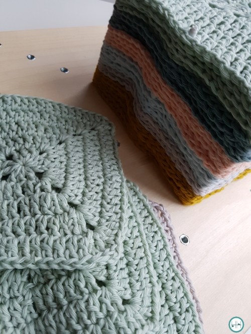 De granny’s zijn altijd goed voor heel veel haakplezier. In wat voor patroon je ze ook haakt. Ik koos zelf voor een makkelijk patroon. Ééntje die je tomeloos weg haakt. Na een goede afloop van ons ziekenhuis avontuur, kwam ik erachter dat ik van een bepaalde kleur niet zo gek veel wolletjes had. Ik besloot dan ook om eerst díe kleuren op te haken. Daarna moest ik bepalen hoeveel granny’s ik precies nodig had om dit project af te ronden tot een babydeken. In totaal waren dat er 32 en ik heb ze gelijk geblockt op de speciae blokspanner.