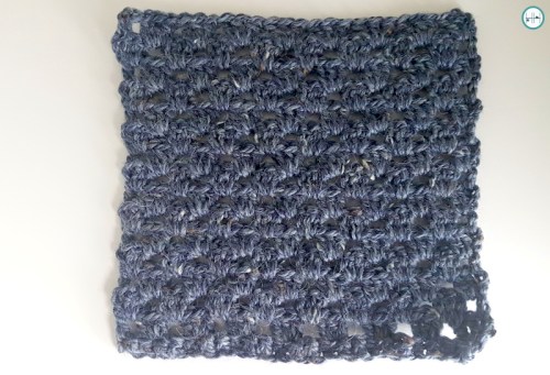 Een ander patroon van deze maand is een granny square, maar dan een hele dichte. Een leuke variatie en het is ook zeker een patroon dat je nog vaker kan gebruiken met bijvoorbeeld kussens of dekens. Dit is echt een heerlijk tomeloos patroon. Van dit patroon heb ik daarom twee lapjes gehaakt. Hiervoor gebruikte ik haaknaald 4,5 mm en één bol Schachenmayr Bravo wol in de kleur storm grey heather (08319).
