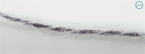 Ik weet nog precies wat ik dacht toen ik dit garen uit mijn Mystery Blanket tas haalde: wow, wat zacht! Elke keer als ik een bolletje aanraak, denk ik weer hetzelfde. Als je de begindraad uit de bol trekt, vallen mij er direct een aantal dingen op. De basis van de draad bestaat uit een wat dikkere acryldraad. Daaromheen zit een draadje gedraaid in een iets donkerde tint waar vele lange, dunne ‘haren’ aan zitten.