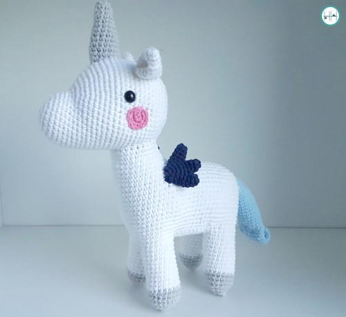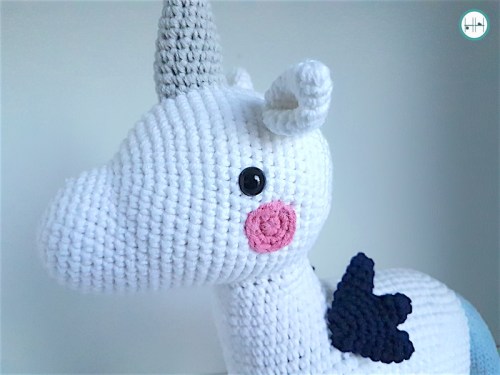 Ik heb ervoor gekozen om de manen weg te laten. Ik had dit deel wel gehaakt. Sterker nog, ik was het al aan het vastnaaien, maar ik vond mijn eenhoorn zonder gewoon iets leuker. Meestal bemoeit mijn vriend zich niet met mijn haakwerkjes, maar dat was bij dit project echt anders. Hij zag de foto in het boek en hij vond de eenhoorn gelijk al ‘cool’.