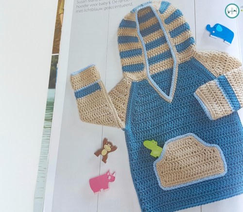 • Hoodie/trui voor baby’s in zandkleur met blauw met capuchon en buidelzak (op de cover)