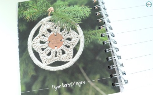 Maar kies je voor een algemenere tekst op het label en maak je er franjes aan, dan heb je een dromenvanger. Mariska gebruikt Durable Macramé en dat is natuurlijk wat dikker. Maar dit zijn dit ook ideale projecten voor het ophaken van restjes katoen of ander garen. Bedenk je dan wel dat de ‘kerstballen’ kleiner uitvallen.