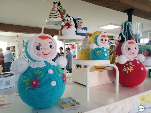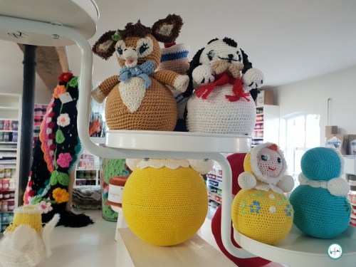Gelijk bij binnenkomst word je al vrolijk door deze kleurrijke tuimelaars. Een eigen idee en ontwerp van eigenaresse Esther. Ik was al gelijk verliefd, haha! Deze grotere versie heeft ze speciaal ontworpen voor de aankomende beurzen waar ze vertegenwoordigd zal zijn. Zoals de Knit & Knot beurs in Tilburg en de KreaDoe in Utrecht. De haakpakketten van deze grote versie zijn momenteel nog in ontwikkeling.