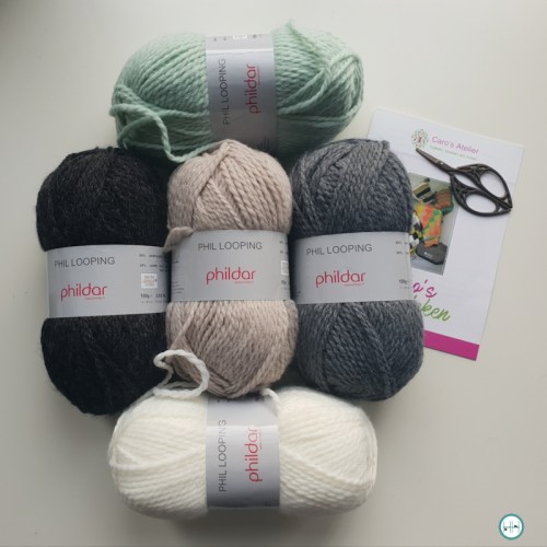 Er worden vijf kleuren gebruikt van het fijne Phildar Looping garen. Omdat ik wolletjes altijd graag wil voelen en in het echt de kleuren wil zien, heb ik gewacht op de Knit&Knot beurs en daar het pakket gekocht bij de desbetreffende winkel. Bij thuiskomst wilde ik gelijk een proefstukje haken haha!