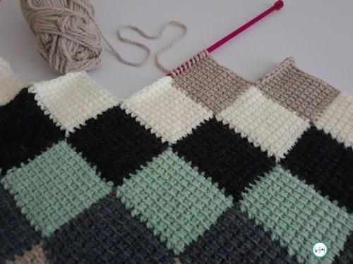 Het tunisch haken had ik al eens eerder gedaan, maar de techniek entrelac nog nooit. Je haakt door middel van een speciale tunische haaknaald de vierkantjes gelijk aan elkaar. Het is veel makkelijker dan dat het eruit ziet kan ik je vertellen én het is ook erg verslavend om er aan te werken. Het patroon bevat een duidelijk uitleg en ook welke kleuren je wanneer moet gebruiken staat erin. Vond hem écht heel stoer worden!