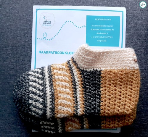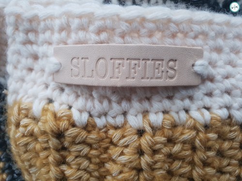 Ook zitten er twee leren labels in met daarop de tekst ‘Sloffies’ en natuurlijk het patroon. Mijn man heeft schoenmaat 45 en ik haak altijd erg strak. Daarom koos ik voor een grotere haaknaald, namelijk 5,5 mm voor de basis van de slof.