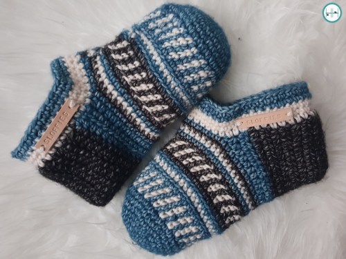 Ook Haakheld Monique heeft slofjes gehaakt. Toen mijn vader ze zag, vond hij dat ook wel wat, haha! Hij wilde liever blauw. Nou, dan gaan we dat regelen. Hieronder zie je het eindresultaat van Haakheld Monique in de kleuren Black Onyx, Moon Stone en Blue Apatite. Omdat zij los haakt heeft ze haaknaald 4.5 mm gebruikt voor maat 41. De lederen labels heeft ze los besteld.