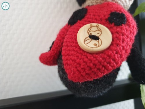 Het eerste patroon dat uitkwam, was van lieveheersbeestje Stip. Deze is ontworpen door Kristel van MyKrissieDolls. In het pakket zaten drie hele bollen Durable Soqs sokkenwol en een klein beetje wit en groen van het Jawoll sokkengaren van Lang Yarns. ‘Onze’ Stip is gehaakt door Haakheld Sharina met naald 2 mm.