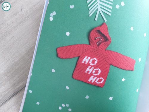 Het boek heet ‘Kleine Kersttruien haken’, maar het is wel breder dan dat. Er zitten namelijk ook winterse tafereeltjes bij zoals een hertje, vogel of bijvoorbeeld een sneeuwpop. Ook zitten er twee ‘niet winterse’ patronen in voor een hamburgertrui en een versie met hartjes. Dat is toch het eigenwijze tintje dat mijn inziens Club Geluk kenmerkt. Daarnaast heb je ook meer traditionele kerstontwerpen met een kerstboom, een Ho-Ho-Ho trui en truitje met een kerstmannenriem.
