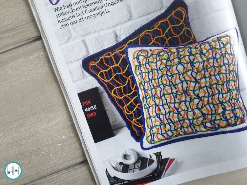 - Kussen met chaotische lijnen die erop gehaakt zijn (op de cover)