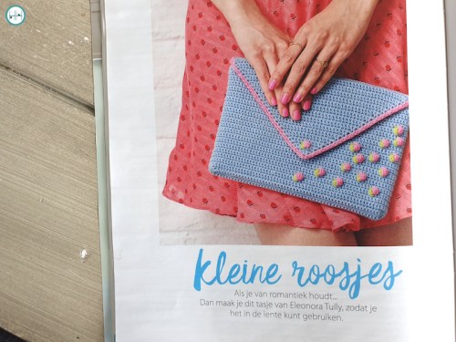 - Rechthoekje clutch met een driehoekige flap. Tijdens het haken, maak je tweekleurige ‘noppen’ die het effect van roosjes geven