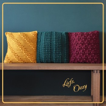 - Poppy pillows: een serie van drie kussen van 40×40 cm waarbij er steeds voor een ander noppen/popcornsteek patroon is gekozen. Met een flap kun je de binnenkussens eruit halen en de hoes wassen.