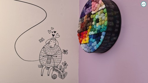 Boven de kassa is deze illustratie op de muur te zien van een breiend schaapje! Er is ook een gehaakte variant van gemaakt die Rachel op de Haakextravaganza had laten zien.