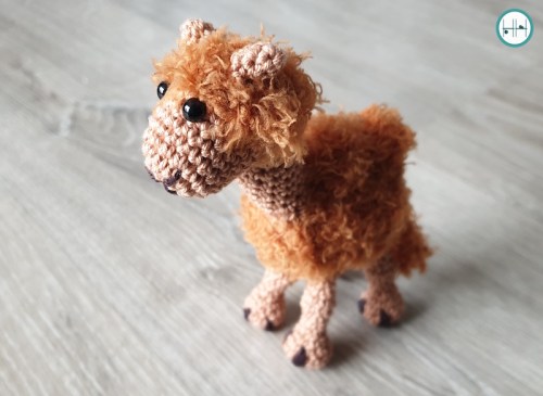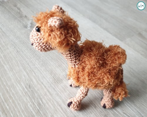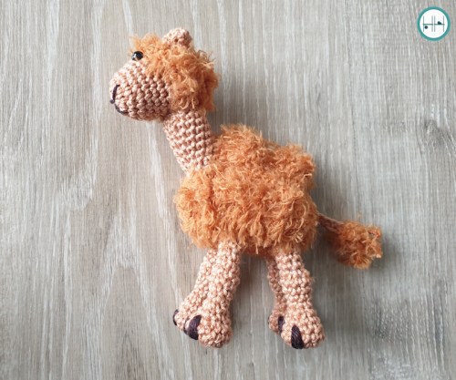 De originele kameel had nog een neus, maar die vond ik toch niet zo leuk op mijn versie. Bij mij vond ik hem veel te aanwezig. Dus drie neuzen met verschillende naalden verder besloot ik de neus weg te laten, haha! Eigenlijk heeft deze lieve kameel nog een tasje en kruiken in verschillende kleuren. Ook hoort om zijn snuit horen nog teugels. Deze heb ik besloten nu niet te haken.